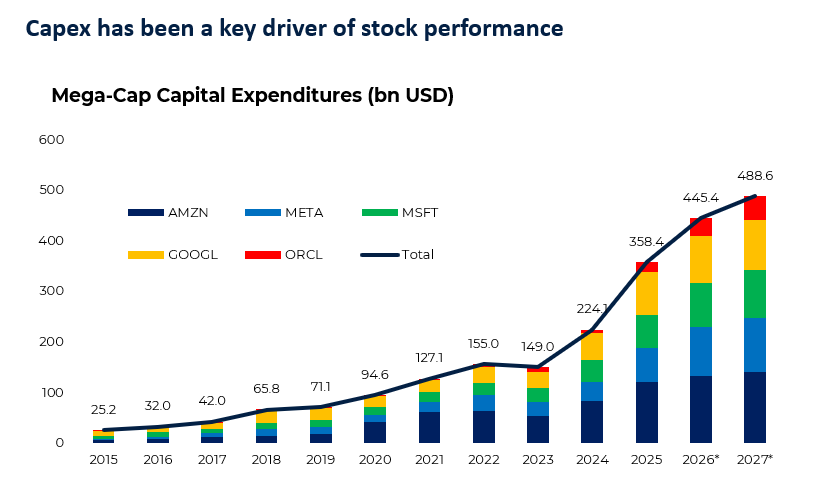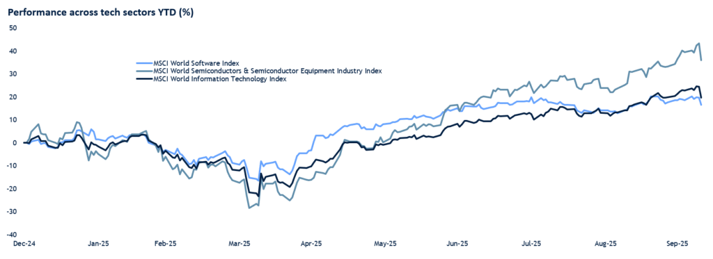 We believe the AI supercycle will continue to create clear winners and losers, consistent with the trends observed year-to-date. As illustrated in the chart above, there is substantial performance dispersion between the “haves” and “have-nots” across broad-based technology. Our goal is to capture as many winners as possible while avoiding underperformers, which is why we favor active management over passive beta exposure for this theme.