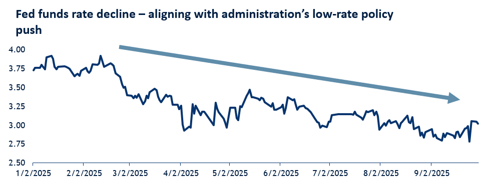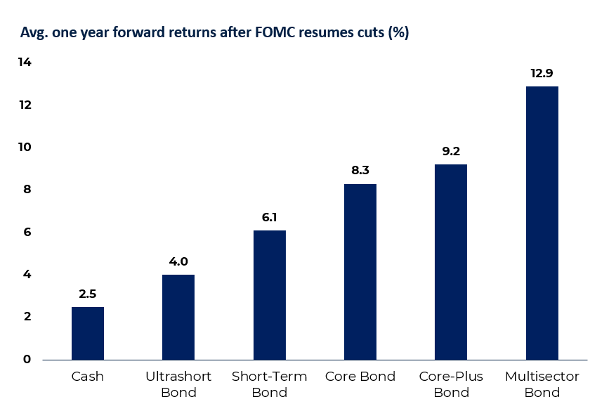 The Fed has resumed its easing cycle after a nine-month pause. Historically, Fed easing has supported risk assets – provided a recession does not follow shortly thereafter. Given our outlook for continued economic growth, we believe this cycle could offer incremental support to markets, particularly in large-cap equities and across multi-sector, core-plus, and core bond segments within fixed income.