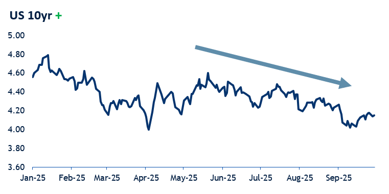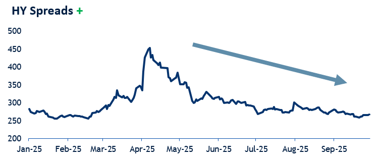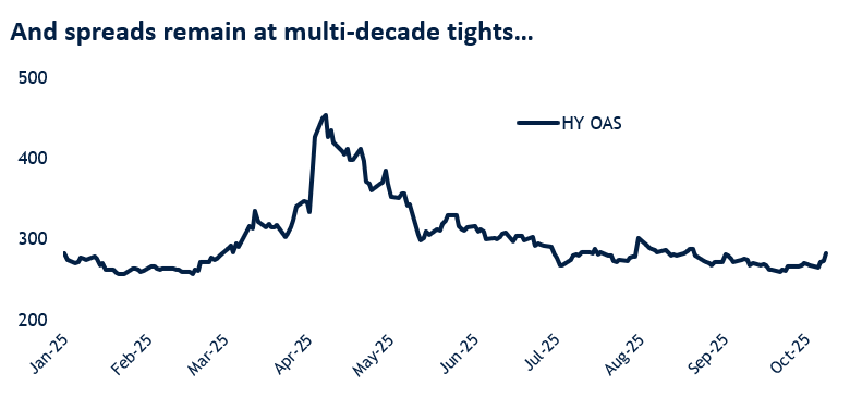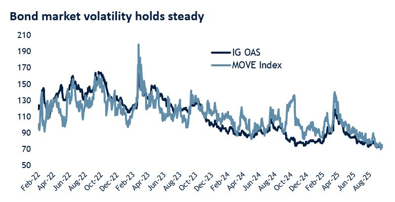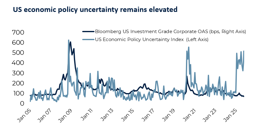 Corporate fundamentals remain solid, supported by a favorable economic backdrop and healthy balance sheets with manageable leverage. While pockets of stress exist within credit markets, overall conditions remain stable. Despite elevated policy uncertainty under the Trump administration, rate volatility has stayed contained – providing a firm foundation for corporate bond spreads to remain tight.