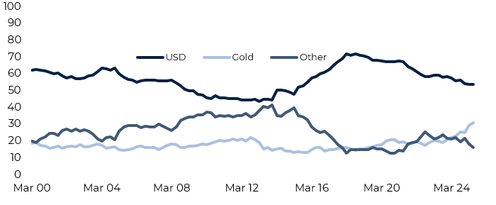 - Global central bank buying: Central banks continue to shift reserves away from the US dollar as a hedge against ongoing deglobalization