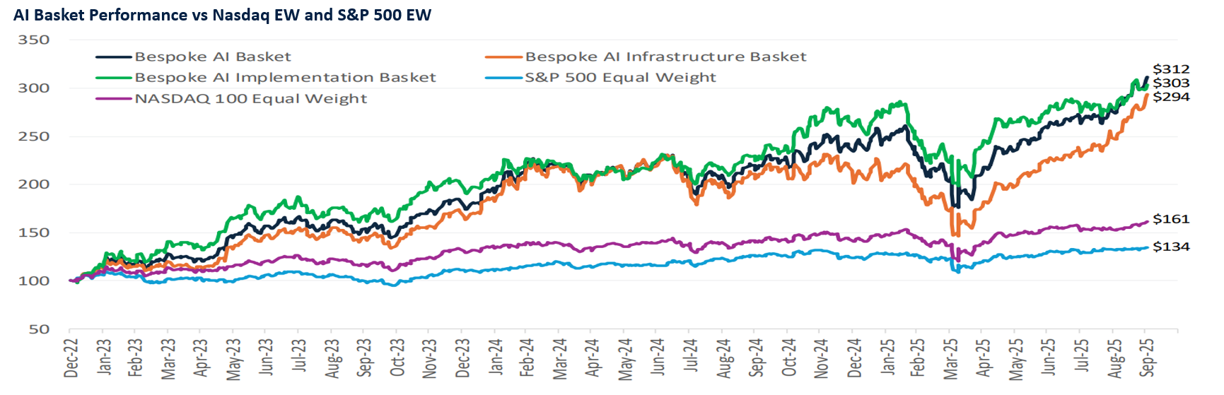 Market performance continues to be driven by performance of companies engrained in or adjacent to AI.
